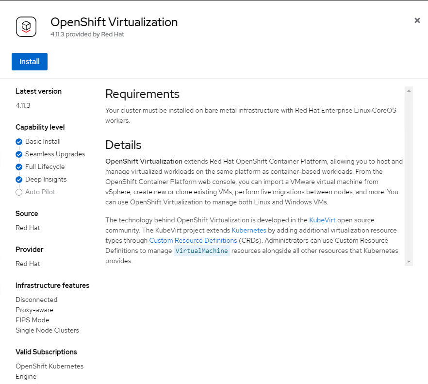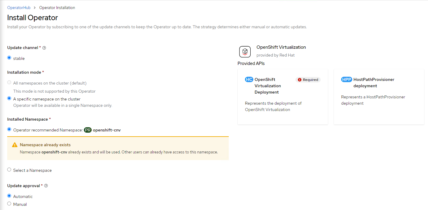 <figure><img src="https://content.gitbook.com/content/TrewSrS6CmLdahLrZUjj/blobs/B9ru2eeT78R7OkR30ESh/image.png" alt=""><figcaption><p>Install OpenShift Virtualization Operator</p></figcaption></figure>