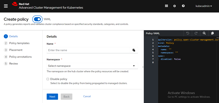So, let’s create the policy by clicking on the “Submit” button in the “Create policy” dialog in RHACM.