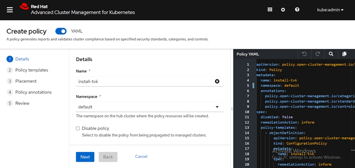 in the RHACM window. After you paste the policy into that YAML-Edit Window in RHACM, you should have the following: