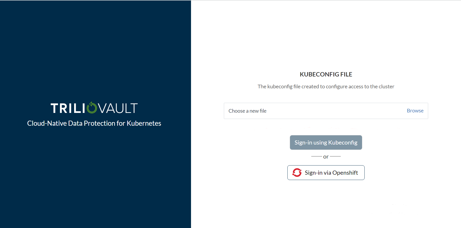 You can sign-in to the Trilio Management Console in your browser (Step 13) by authenticating with a valid kubeconfig file or with your OpenShift credentials.