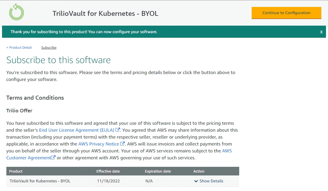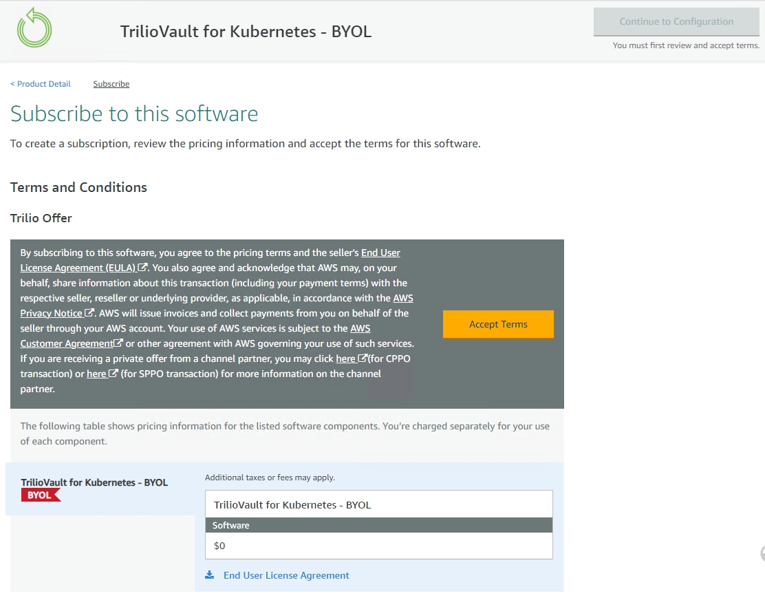 Trilioon the AWS Marketplace and selectTrilio for Kubernetesapplication offer.