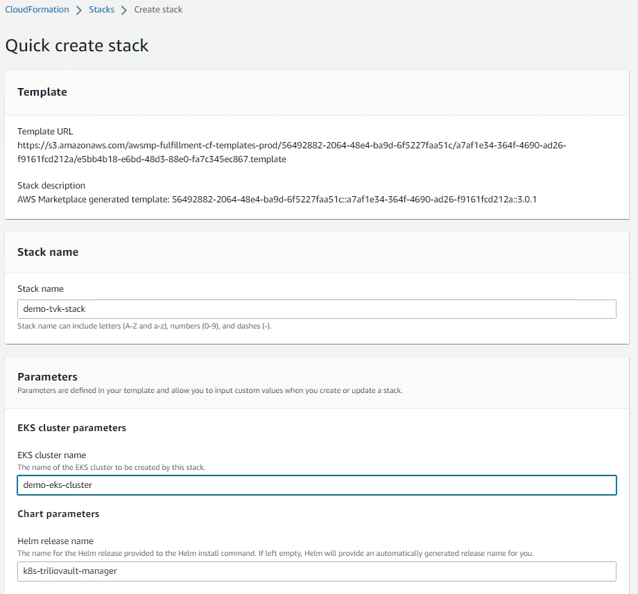 Helm chart is used to perform the product installation. The user can install the product on the existing EKS cluster or use Cloud Formation Template (CFT) to automatically create a new EKS cluster with T4K installed on it.