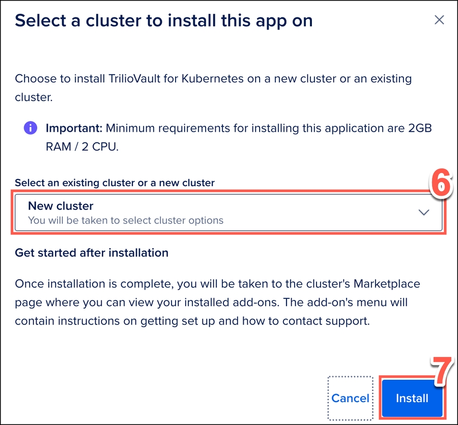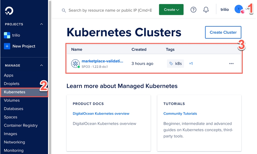 Digital Ocean Cloud provides an upstream version of Kubernetes. Trilio supports both cluster-scoped and namespace-scoped installation on a Digital Ocean Kubernetes Service (DOKS) cluster. A 1-click installation application is listed in Digital Ocean Marketplace, which performs the operations below: