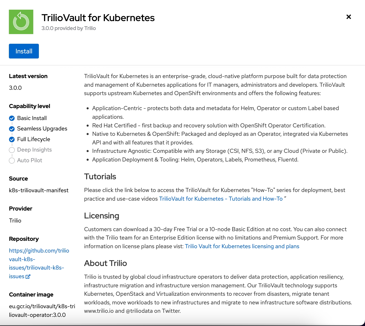 Trilio is available as a Certified Operator in the embedded OperatorHub for OpenShift environments.