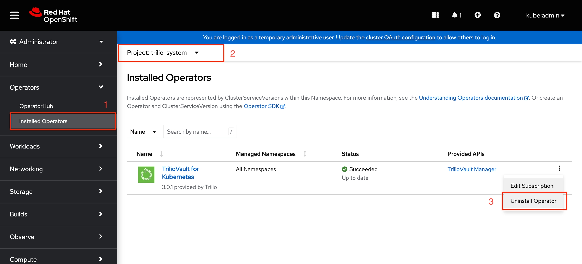 Uninstall the Trilio for Kubernetes Operator - can be done directly from the OpenShift user interface console. After a successful uninstall the Trilio application will not be available.
