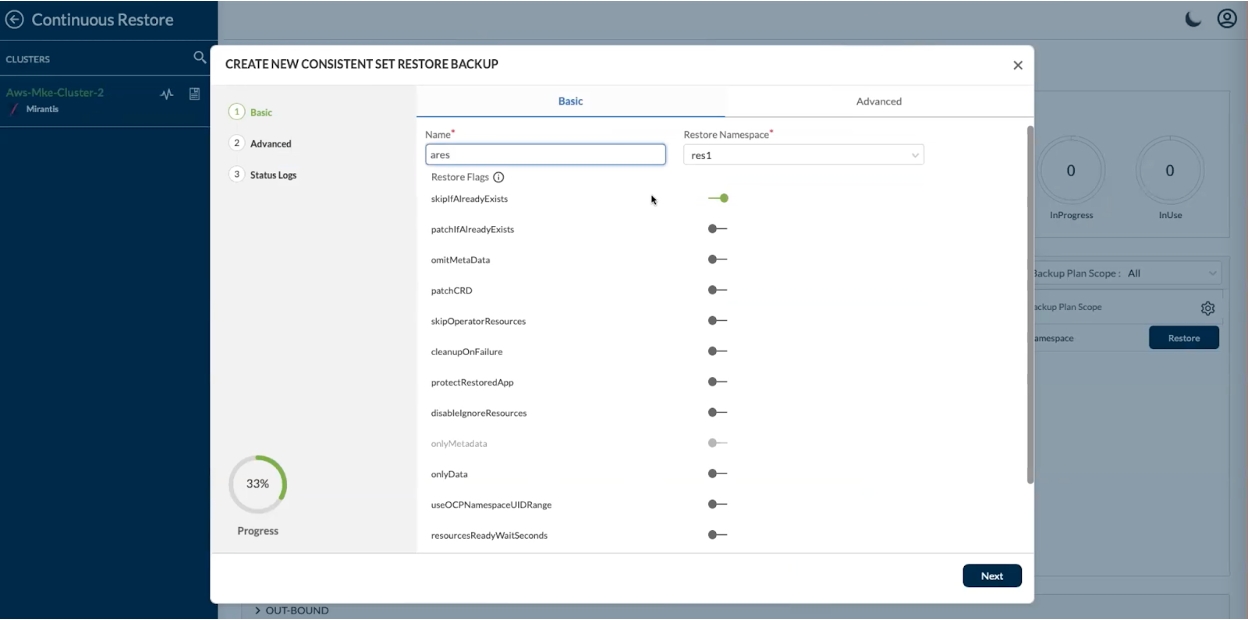 Once continuous restore service and continuous restore responder reconciles the backup plan between clusters, the backup plan in the UI is shown as follows: