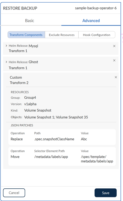 From a resource transform perspective, Trilio provides the ability to transform Helm Charts and transform custom resources. Helm charts can be transformed based on Key:Value pairs whereas custom resources can be transformed by specifying GVKO and Operation (Replace, Move etc.) type.