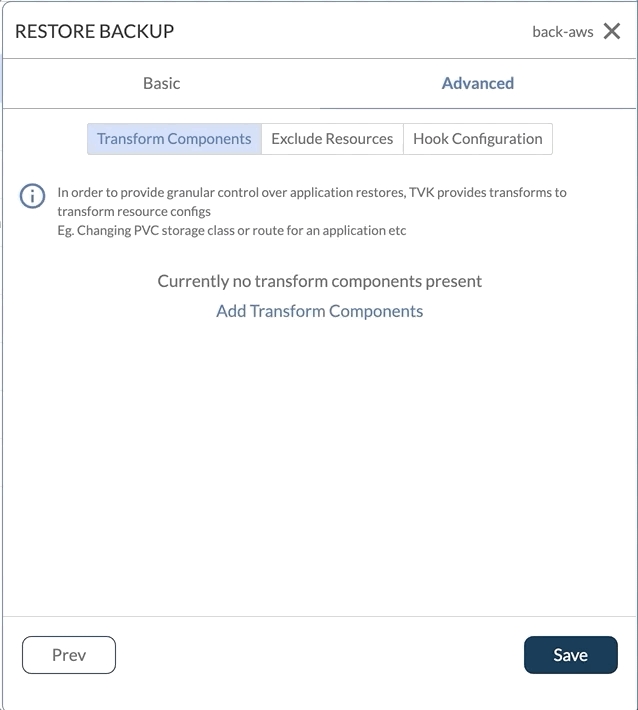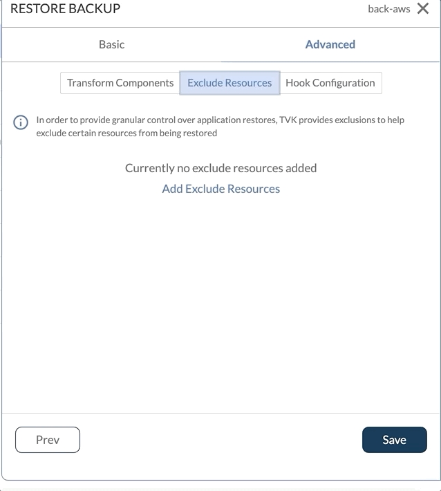 For the restore workflow, there are two tabs presented to the user - Basic and Advanced. Basic restores cover general restore properties for the backup - skip resources, patch CRDs etc. whereas Advanced restores cover resource transformation, resource exclusions, and resource hooks.