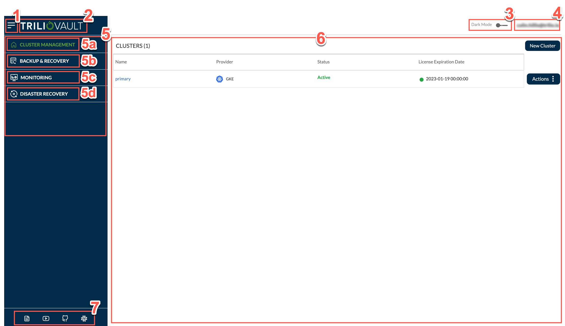 The T4K management console displays a main menu to the left side of the UI. When main menu items are selected, they expand into various tabs and pages focused on particular tasks. The image and associated table below also highlight some of the common UI functionality that appear throughout the Management Console UI pages.