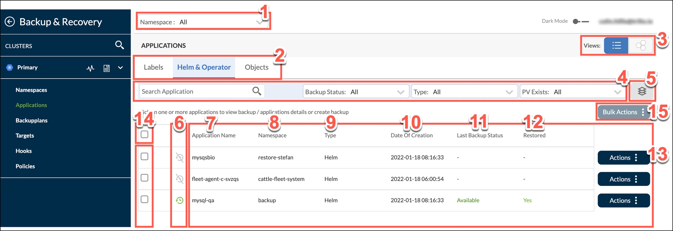 The Applications page provides a top-level overview of all your cluster Applications and provides links to take actions for each. When a cluster is selected, this page displays your backup and restore options available for all Namespaces within the selected cluster.