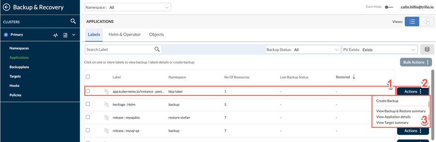 View YAML - Click this to display a page with two tabs, T4K Resource YAML and Application YAML. T4K Resource YAML is displayed by default, which provides the ability to view and copy all YAML files for Backup, Backupplan, Hook, Target and Target Credential Secret.