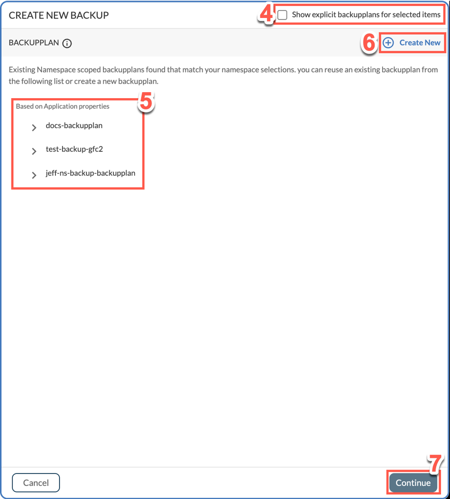 If no existing plan is suitable, select Create New and follow the instructions in Backup Plan - Application. Note that if you create a new backup plan, it may take some time before it becomes active and is able to be selected. Once the new backup plan becomes available, select it and proceed.