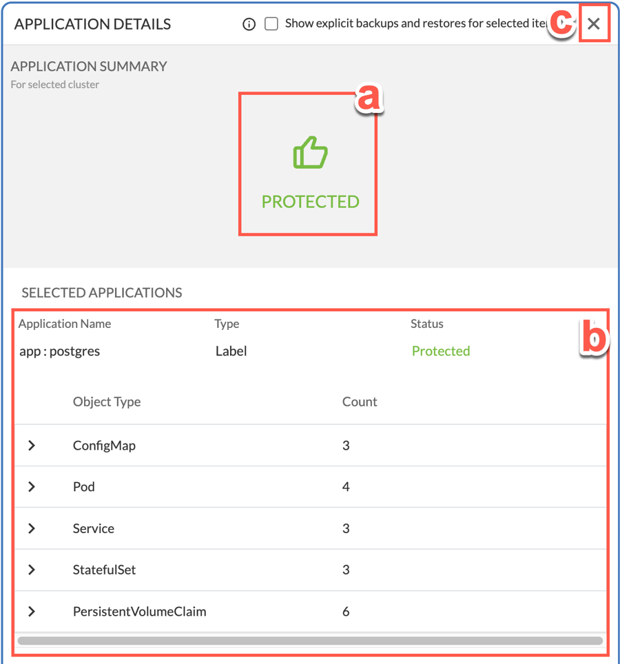 Optionally, you can place a check in the Show explicit backups and restores for the selected items checkbox. Checking this box will result in the widgets showing only backups and restores for selected items. For example, if a user has selected NS1 and NS2, then only backups and restores containing NS1 and NS2 will be shown. Otherwise, backups and restores containing either NS1, NS2 or both NS1 and NS2 together will be shown.