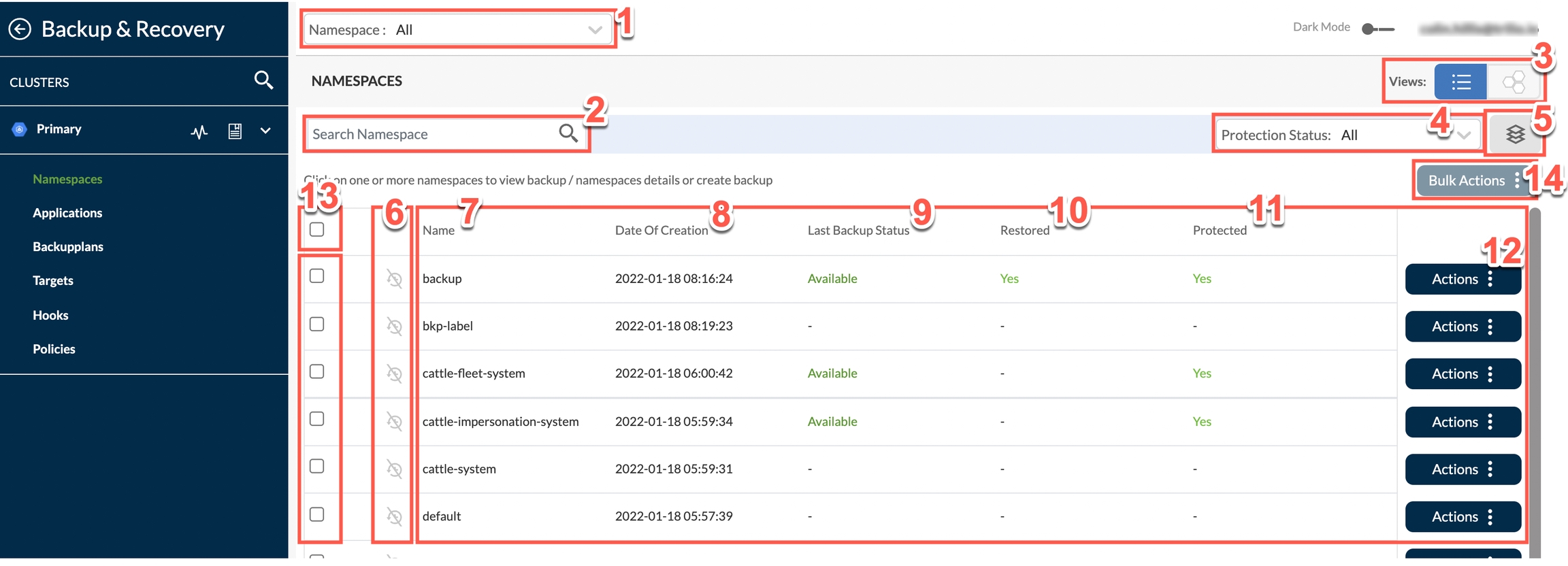 This is the default landing page for Backup & Recovery. It provides a top-level overview of all your cluster Namespaces and provides links to take actions for each. When a cluster is selected, this page displays your backup and restore options available for all Namespaces within the selected cluster.