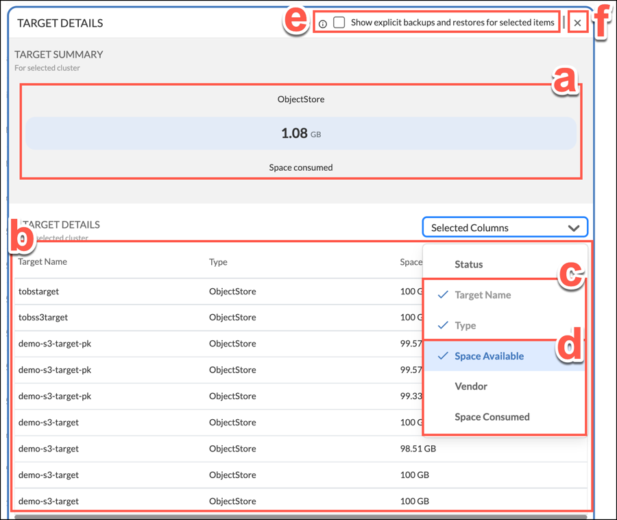 This table lists the selected targets and displays the space that they each consume. The first two columns are mandatory and the third column (Space Available) can be changed to Vendor or Space Consumed.
