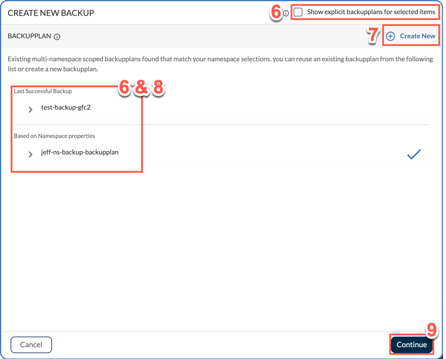 If no existing plan is suitable, select Create New and follow the instructions in Backup Plan - Multi-namepspace.