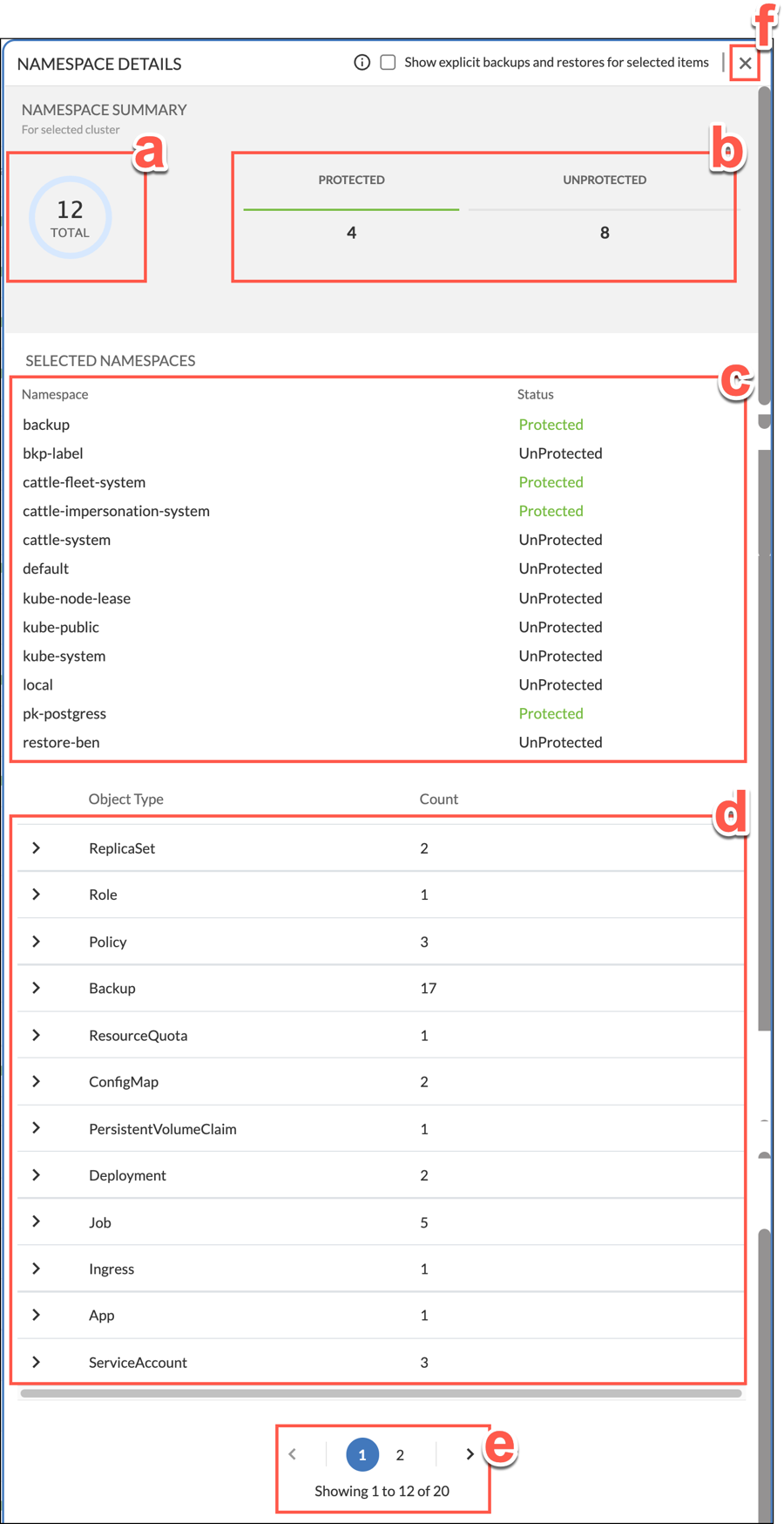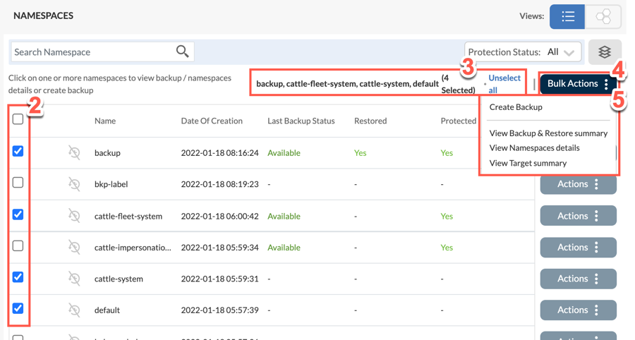 From the Backup & Recovery's Namespace page, identify the listed namespaces for which you wish to perform an action.