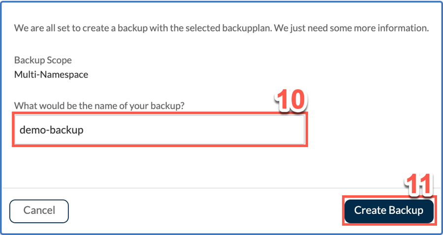 From the CREATE NEW BACKUP wizard displayed, check if any existing backup plans are available, either under Last Successful Backup or under Based on Namespace properties. Optionally, you can place a check in the Show explicit backupplans for the selected items checkbox. This results in the existing backup plan list showing only backup plans for selected items. For example, if a user has selected NS1 and NS2, then backup plans containing NS1 and NS2 only will be shown. Otherwise, backup plans containing either NS1, NS2 or both together will be shown. If you see an existing backup plan that suits, skip to step 8.