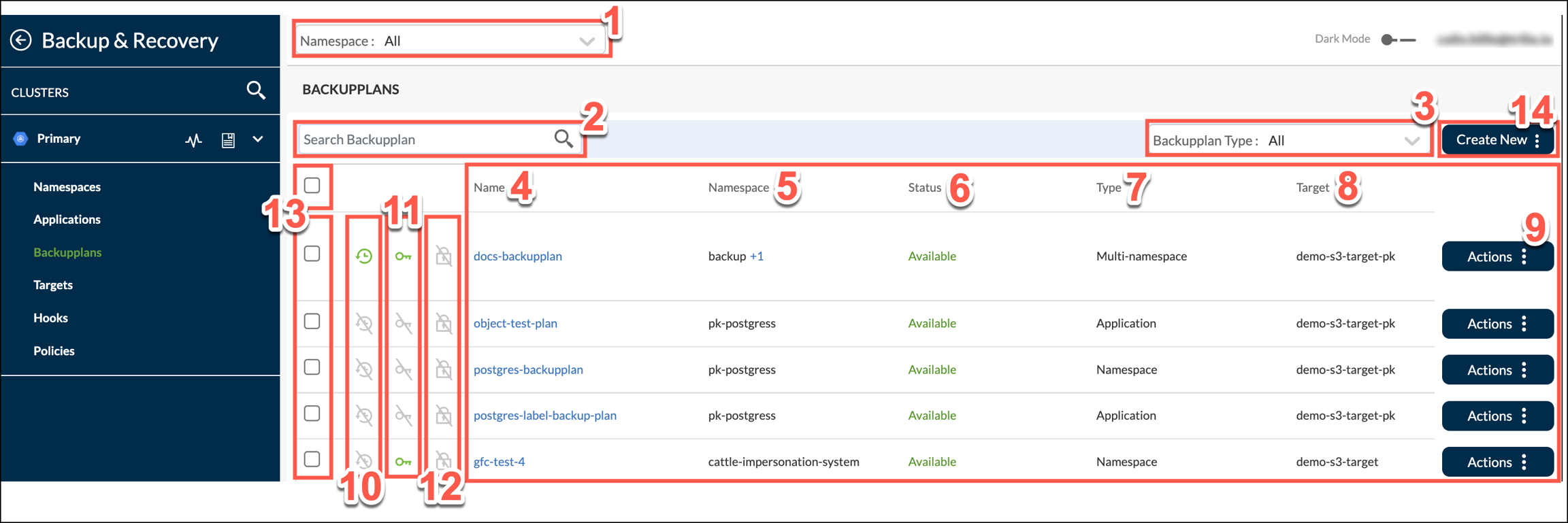 This page provides users with an overview of all the backup plans associated with a selected cluster.