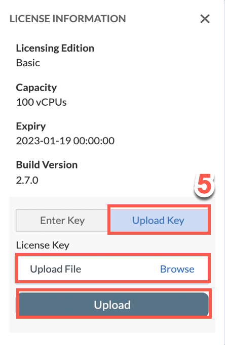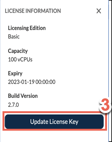 The Actions button (field/button 5 in the image above) provides a dropdown menu of actions that a user can take in relation to the cluster selected. Currently the only option available is License Update, but this is likely to extend in the future. Follow the guidance below for each of the actions available.