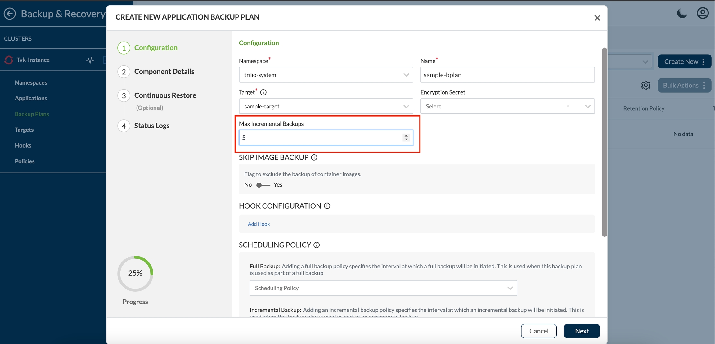 Immutable backups can not take "forever" incremental backups as we can with standard Trilio backups. Each immutable backup has a set number of incrementals to be taken, with the backup expiring at the conclusion of the last backup in the chain. Trilio has introduced a field MaxIncrBackupsPerFullBackup