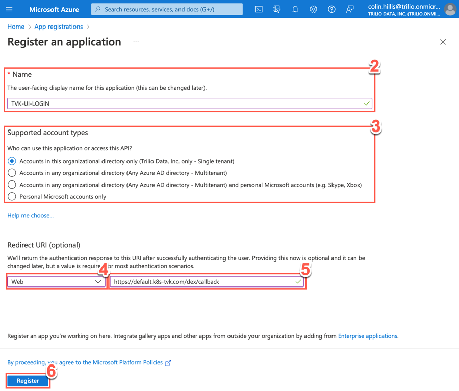 Type the redirect URI https://default.k8s-tvk.com/dex/callback.
