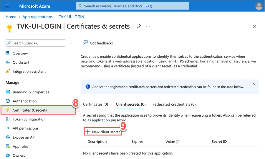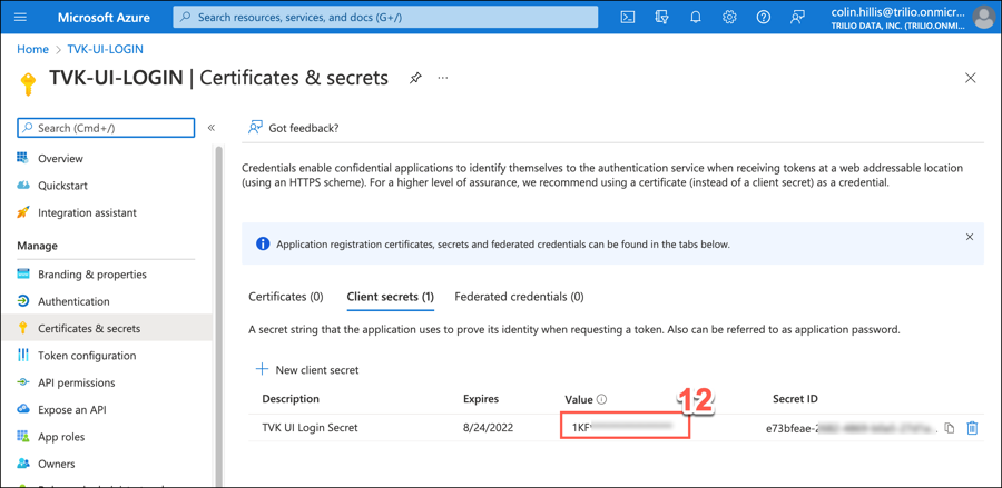 The Client secrets tab automatically displays available secrets. Copy the Value for the secret just added.