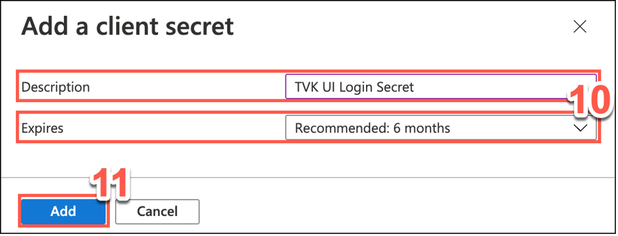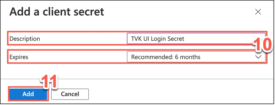 In the pop-up window displayed, type a meaningful Description for your client secret, e.g. TVK UI Login Secret. Also set an expiry period.