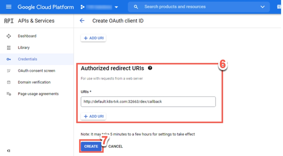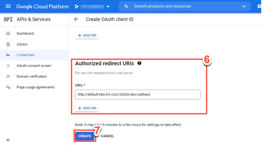 Add authorized redirect URIs as the TVK call back URL. For example, for the NodePort use http://default.k8s-tvk.com:32663/dex/callback and for the LoadBalancer use: http://gke-270.k8s-tvk.demo.trilio.io/dex/callback