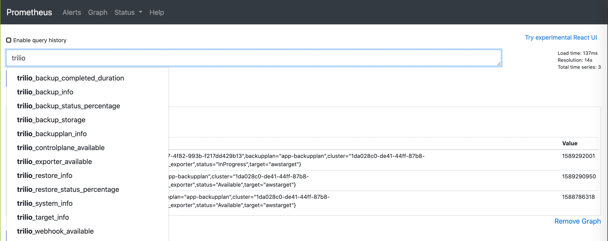Trilio for Kubernetes has pre-configured the above annotations on the Metrics Exporter pod. If you have a cluster with Prometheus already installed and configured, then your Prometheus instance should start collecting Trilio for Kubernetes metrics without any configuration change.