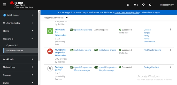 Before we create the policy, let’s again check the list of installed operators on the cluster itself in its OpenShift UI: