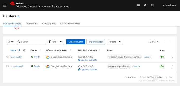 An important note here: One of the clusters was prepared with the label protected-by=triliovault