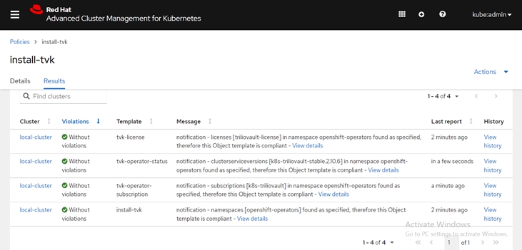 This concludes how to install Trilio for Kubernetes (T4K) on the clusters managed by ACM. This policy will also protect the new clusters if those are Openshift clusters with a label protected-by=triliovault.