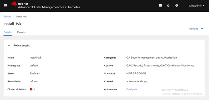 We see that RHACM detected that the policy shall be used on 1 cluster and that the policy is NOT adhered to in this cluster. Therefore, we have one policy violation. We can click on the policy name to get a more detailed overview, and there we select the “Results” Tab: