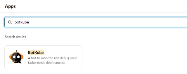 1. Search for the BotKube application in the Apps section on Slack, install the application using the Add to Slack button provided.