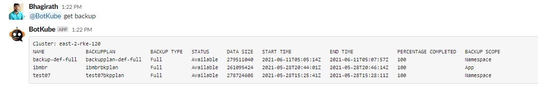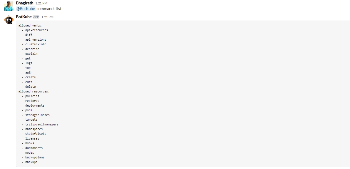 3. Once the Botkube configmap is updated, you can see the updated commands list from slack