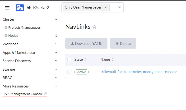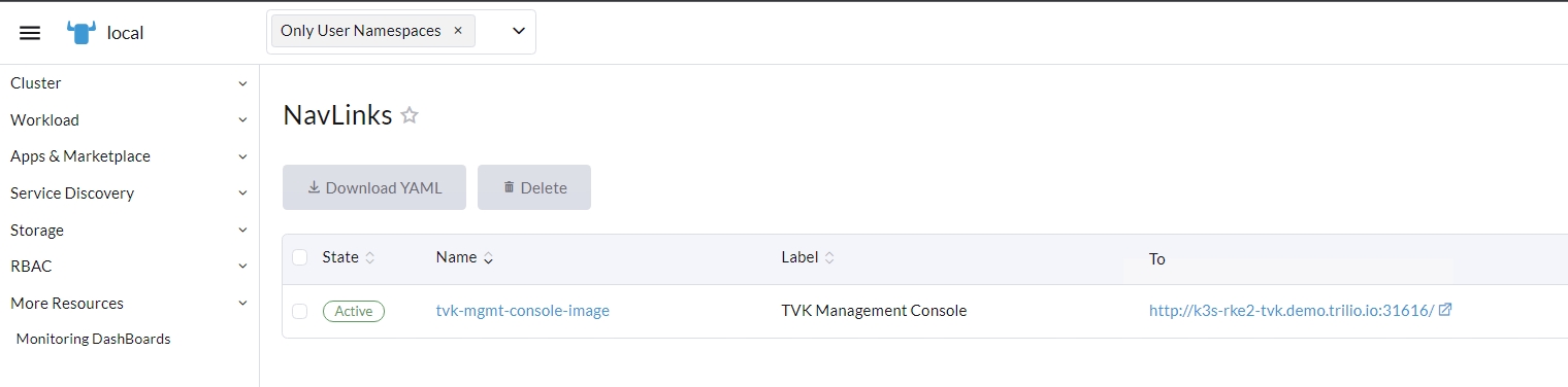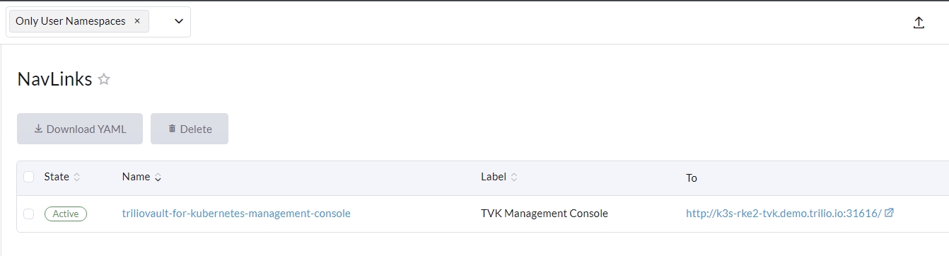 metadata.name: Name of the NavLinkspec.description: Description of the NavLinkspec.iconSrc: Image or icon of the branding logo of the application or the companyspec.label: The label of the URL to be visible on the Rancher UIspec.toURL: Complete URL of the application to be redirected to. The host name isk8s-triliovault-minioningress hosts URL. The port is theNodePortof thek8s-triliovault-ingress-gatewayservice.