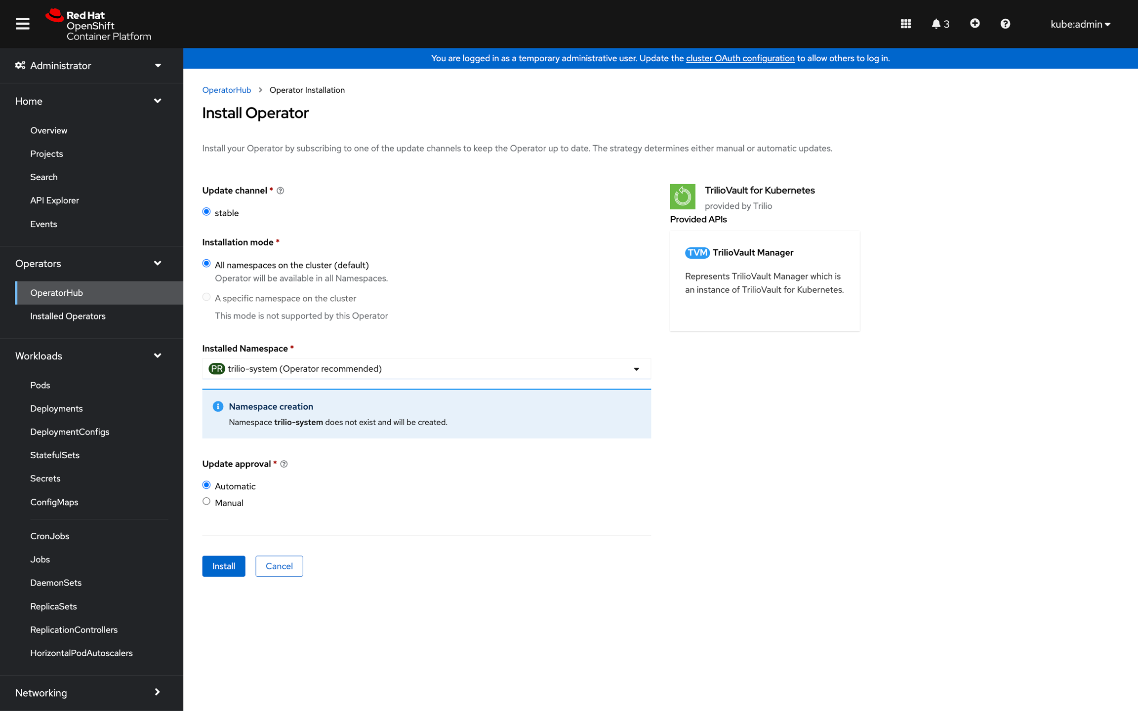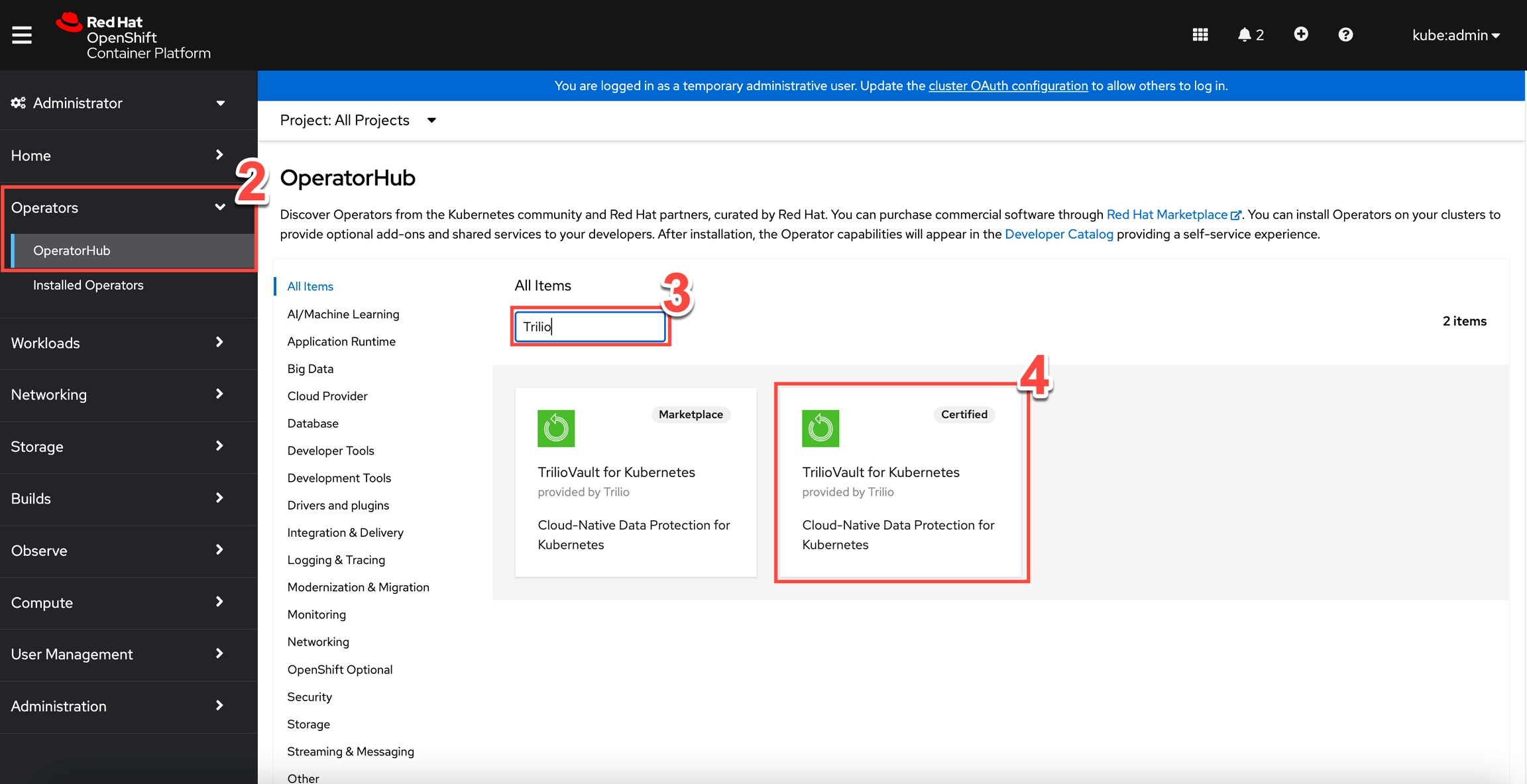 1. Navigate to the OperatorHub console and verify that the Trilio operator is now available to be installed. Log out and back in again if you do not see the operator.