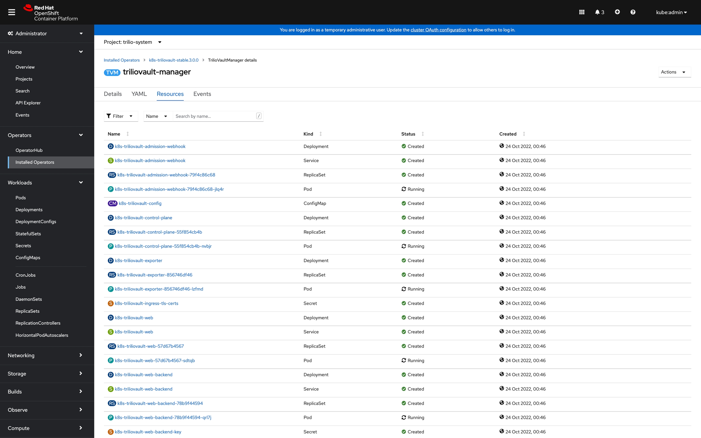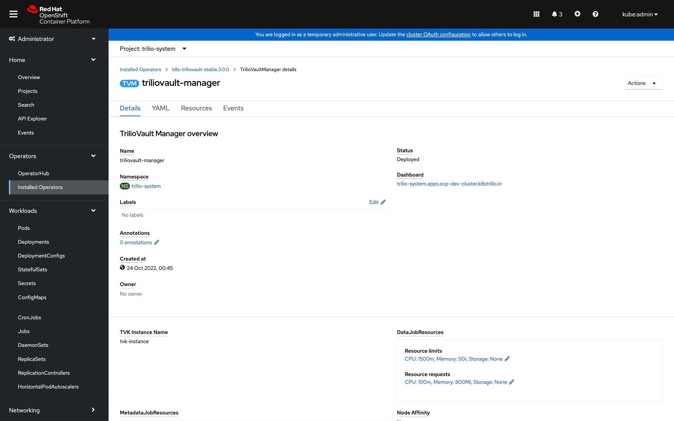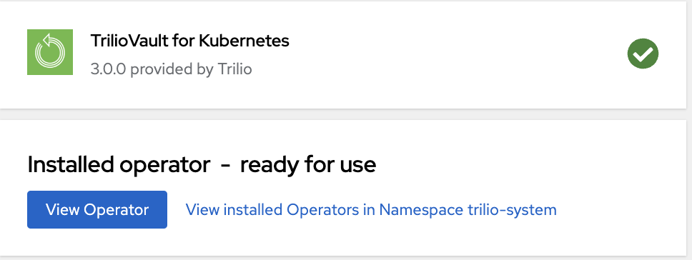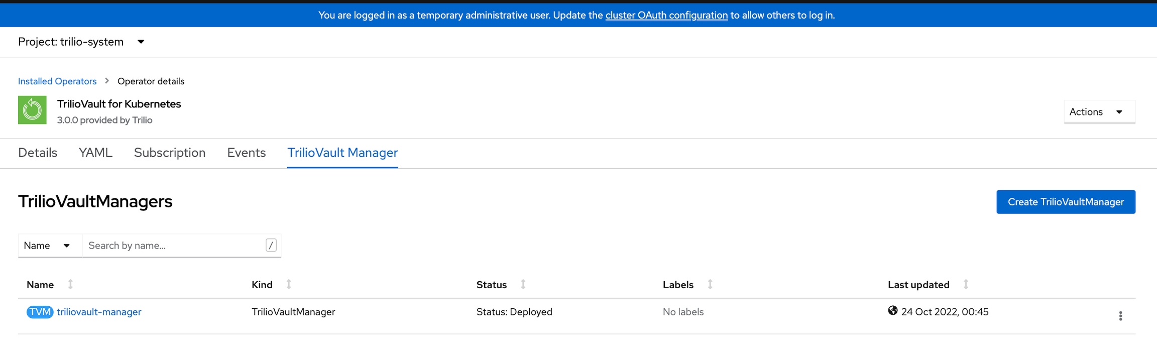 Trilio for OpenShift is a cloud-native backup and restore application. Being a cloud-native application for Kubernetes, all operations are managed with CRDs (Customer Resource Definitions).