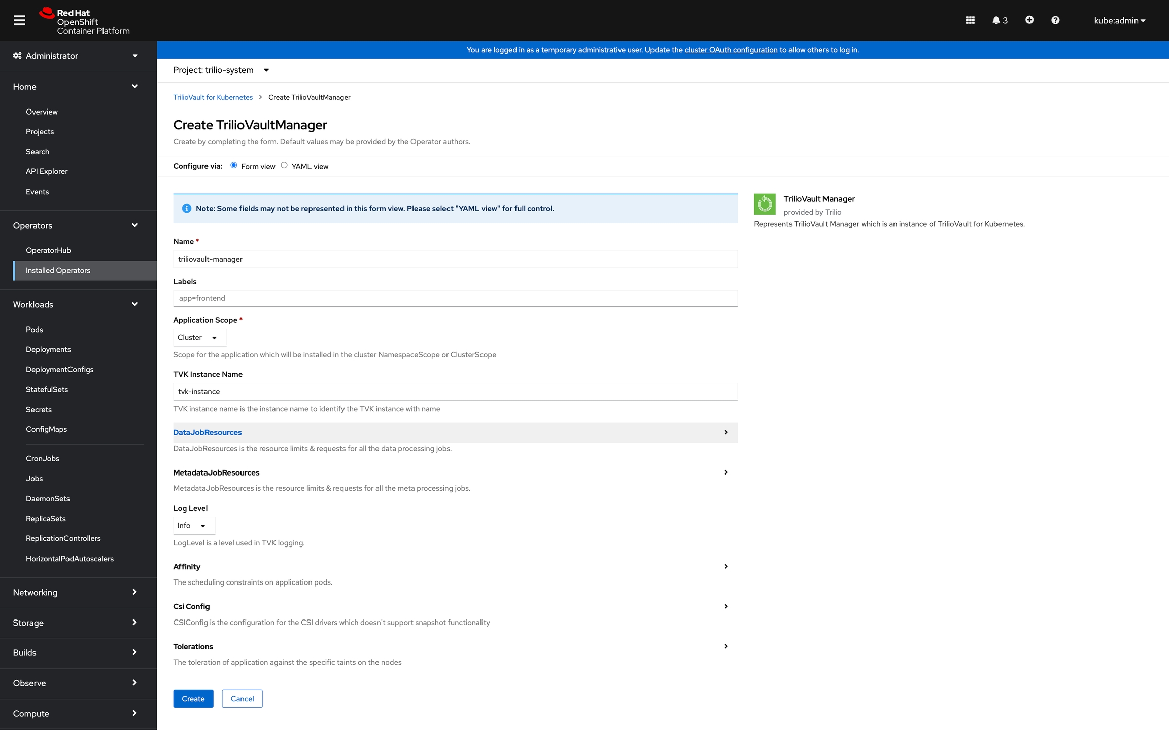 1. Click on Create Instance and fill out the required fields in "form view" to create the Trilio Manager CR. Once completed the Trilio Manager will be deployed.
