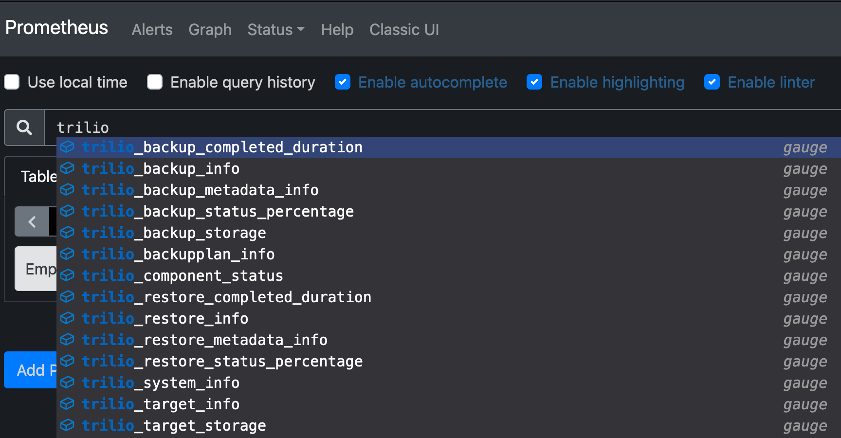 Select the metric trilio_system_info and click the "Execute" button. You should see the table beneath the query field populate with data if the Trilio Exporter is being scraped as expected.