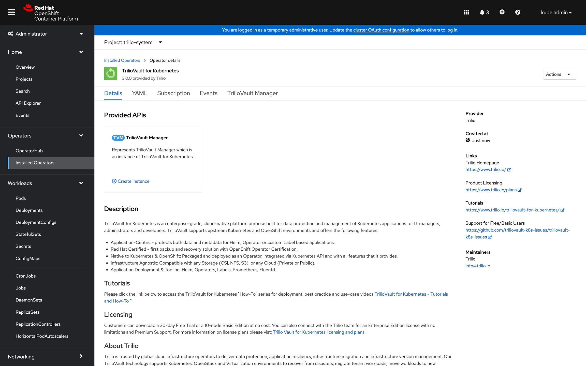 In this tutorial, we'll show you how to install and test operation of Trilio for OpenShift on your Red Hat OpenShift cluster.