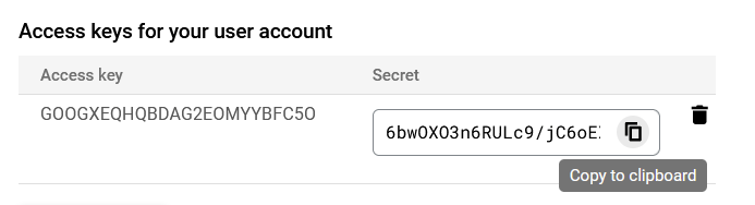 If a service account does not have access key and secret key, follow this guide to generate a new access key and secret key which will be required while creating target.