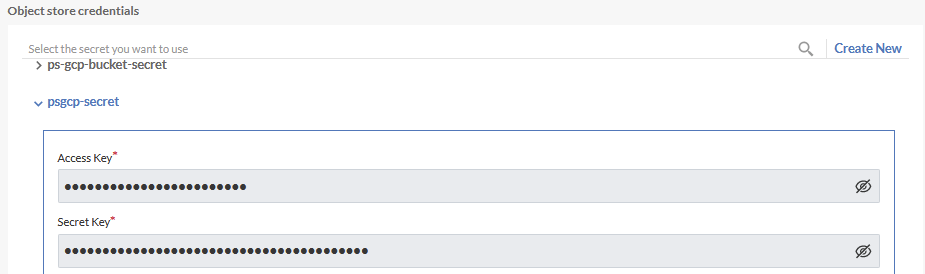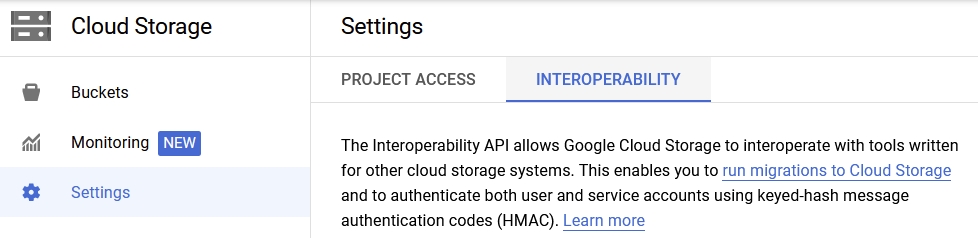 Provide Service User Access key and Secret key from GCP Cloud Storage / Settings / Interoperability / Access