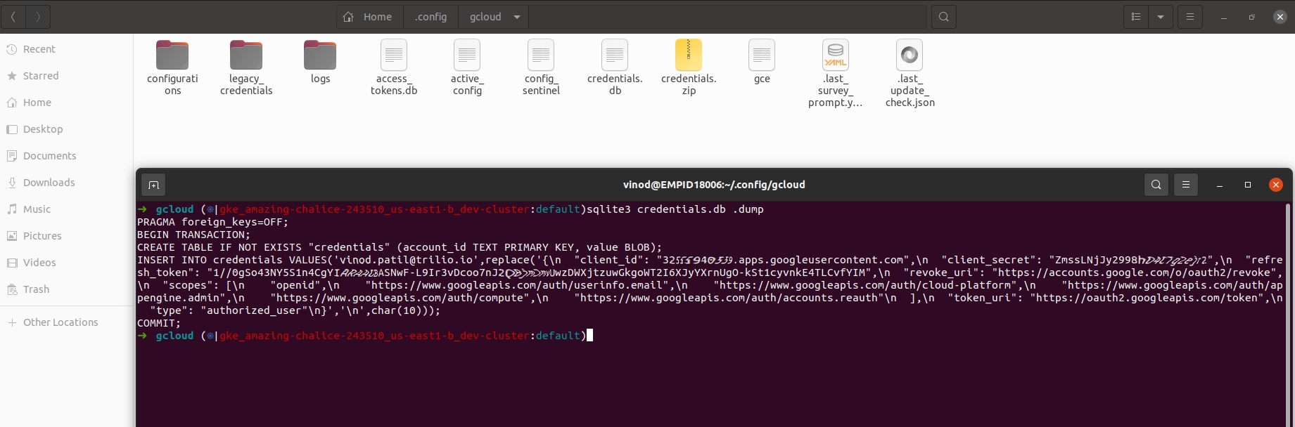 In a GKE cluster, a local binary known as gcloud is used pull the credentials from a sqlite credentials file named credentials.db.