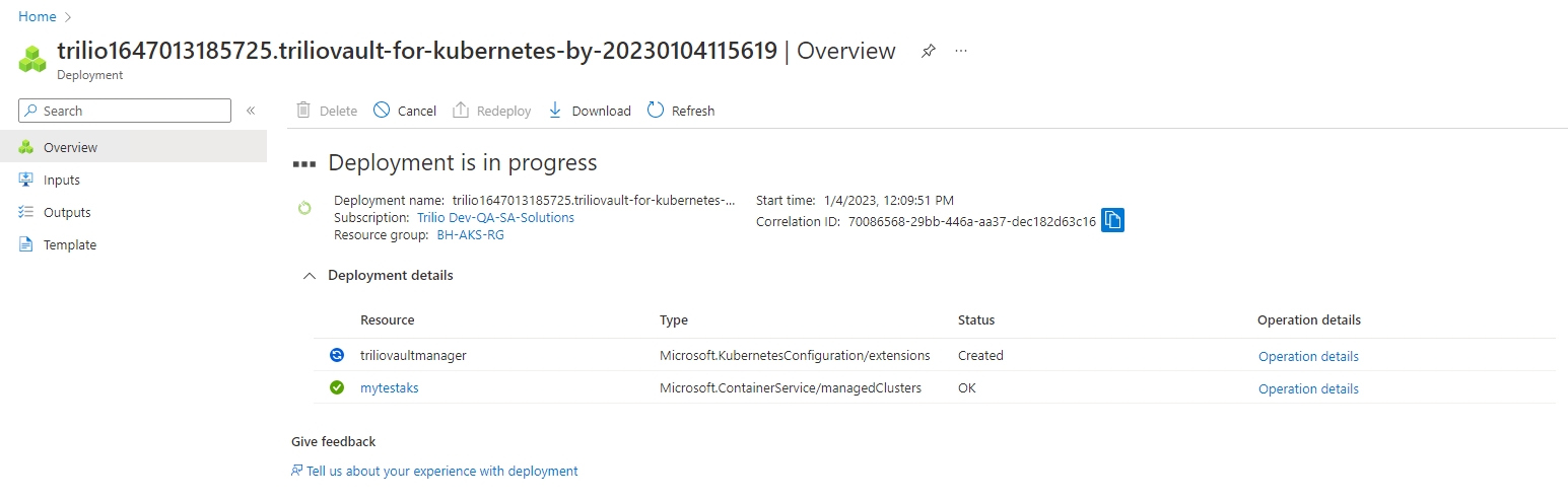 Createbutton to start the AKS cluster deployment andtvkoperatorextension deployment on the cluster.