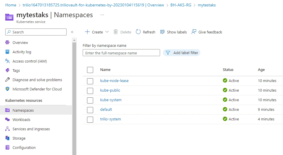 Resource Groupand log in to the AKS cluster from CLI or check if all the T4K resources are created in thetrilio-systemnamespace.