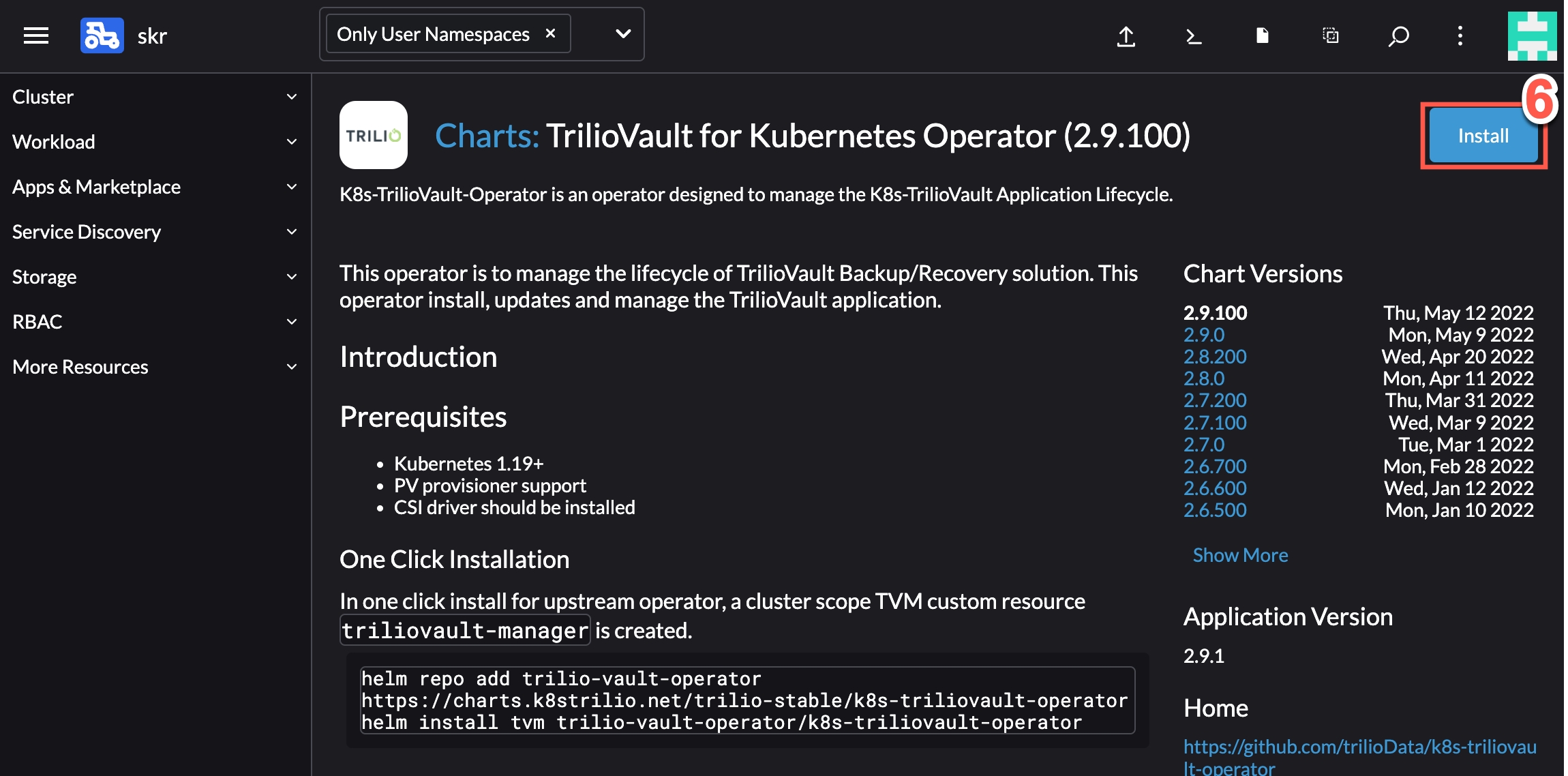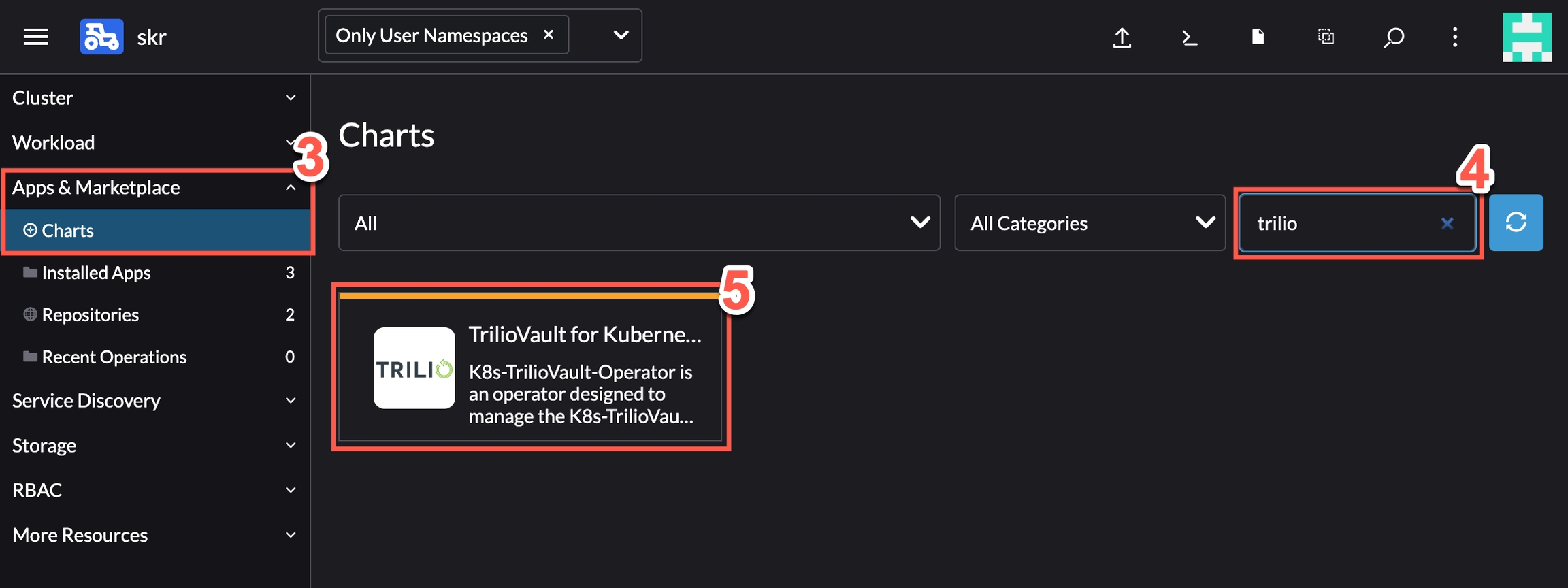 Trilio for Kubernetes provides an operator as a Rancher Partner Chart for Kubernetes cluster deployments and it is present on the Rancher Apps & Marketplace. Here are the instructions to install T4K as a Rancher Partner Chart on RKE cluster deployment.