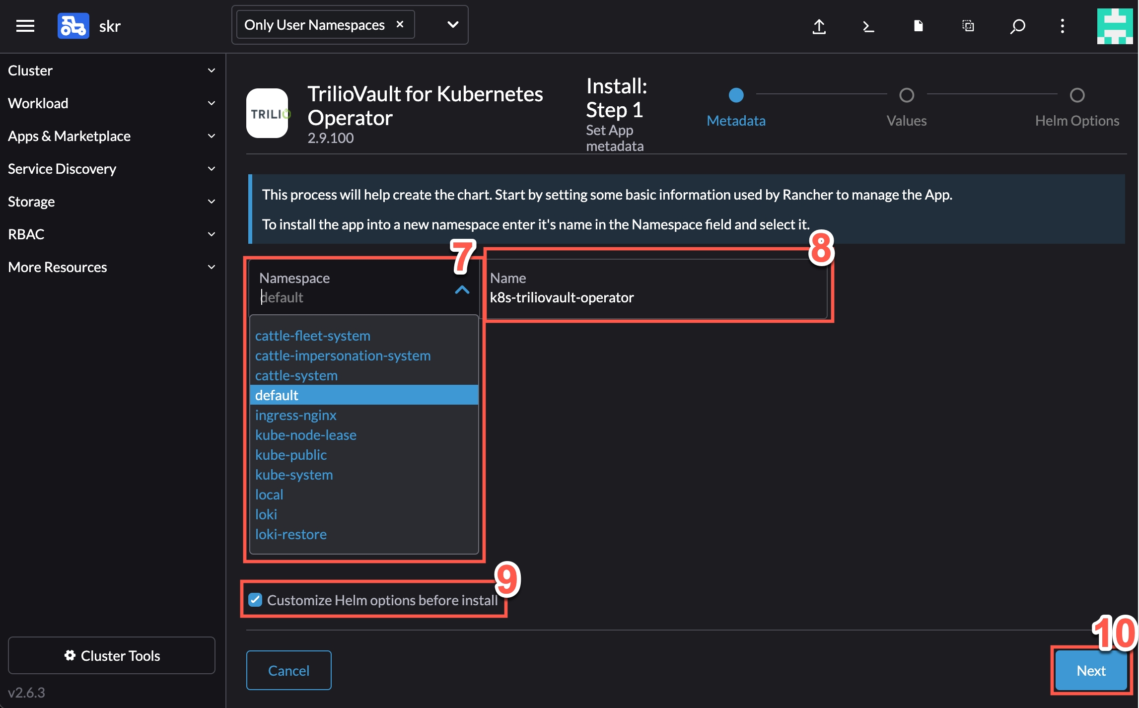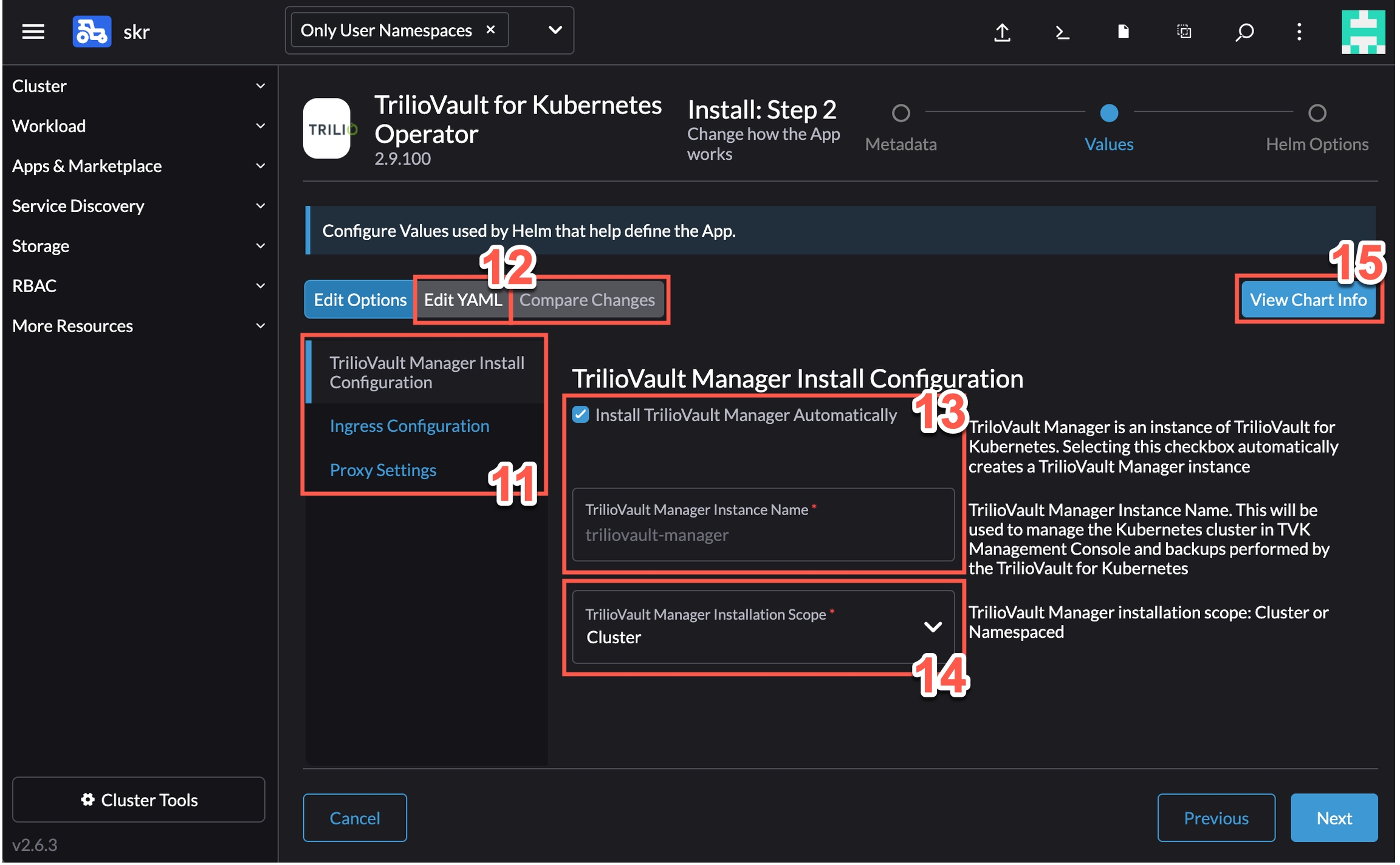14. For Trilio Manager Installation Scope, choose between installing for the entire cluster, or for a specific namespace.
