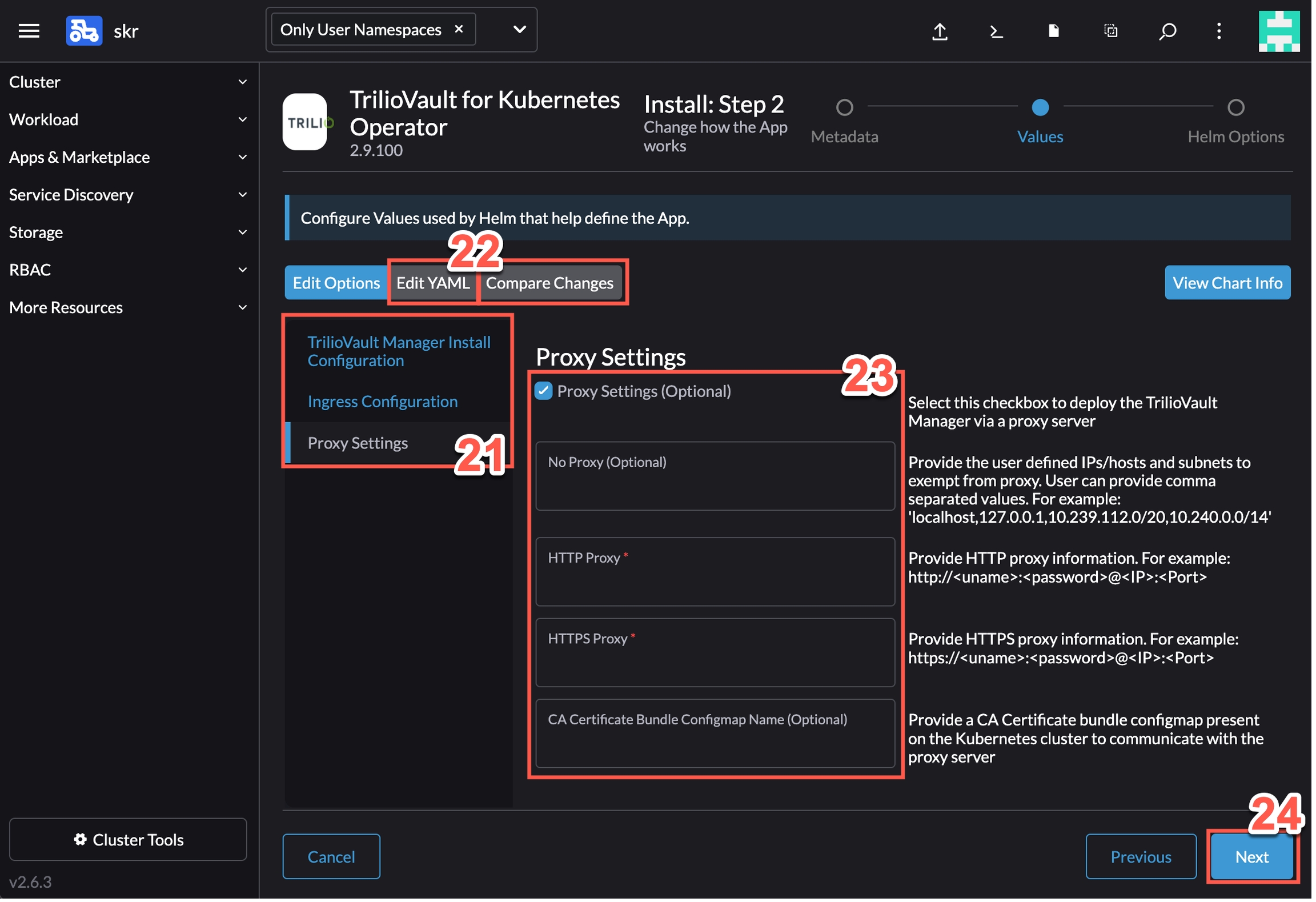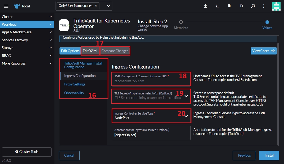 22. Optionally, for more configuration control, you can edit the YAML file using Edit YAML and review your changes using Compare Changes.